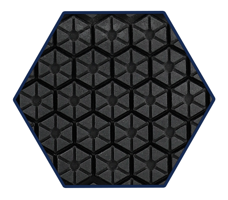 Sulans mönster består av en massa hexagoner som ger 360° halkmotstånd och enkelt avleder vätska från sulan, så att skon står stadigare på underlaget inomhus.