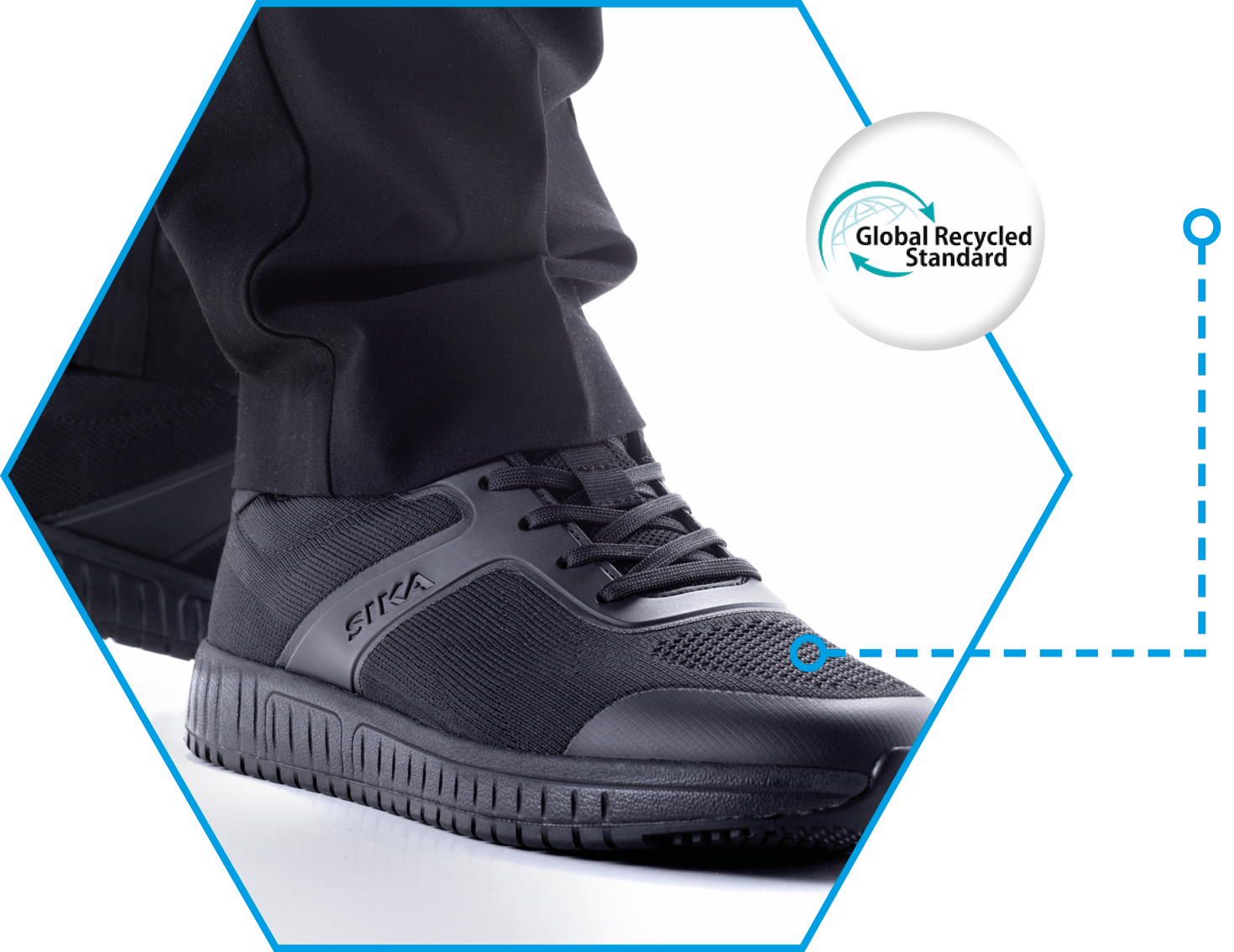 Sneakerliknande arbetsskor med stickad ovandel som andas bra och snörning. Den stickade ovandelen är tillverkad i ett stycke för att minimera spill i produktionen och en del av garnet som används är godkänt enligt Global Recycle Standard (GRS). Yttersulan med hexagonmönster bidrar till 360° halksäkerhet. Luftbubblor i både mellan- och yttersulan ger särskilt bra stötdämpning.
